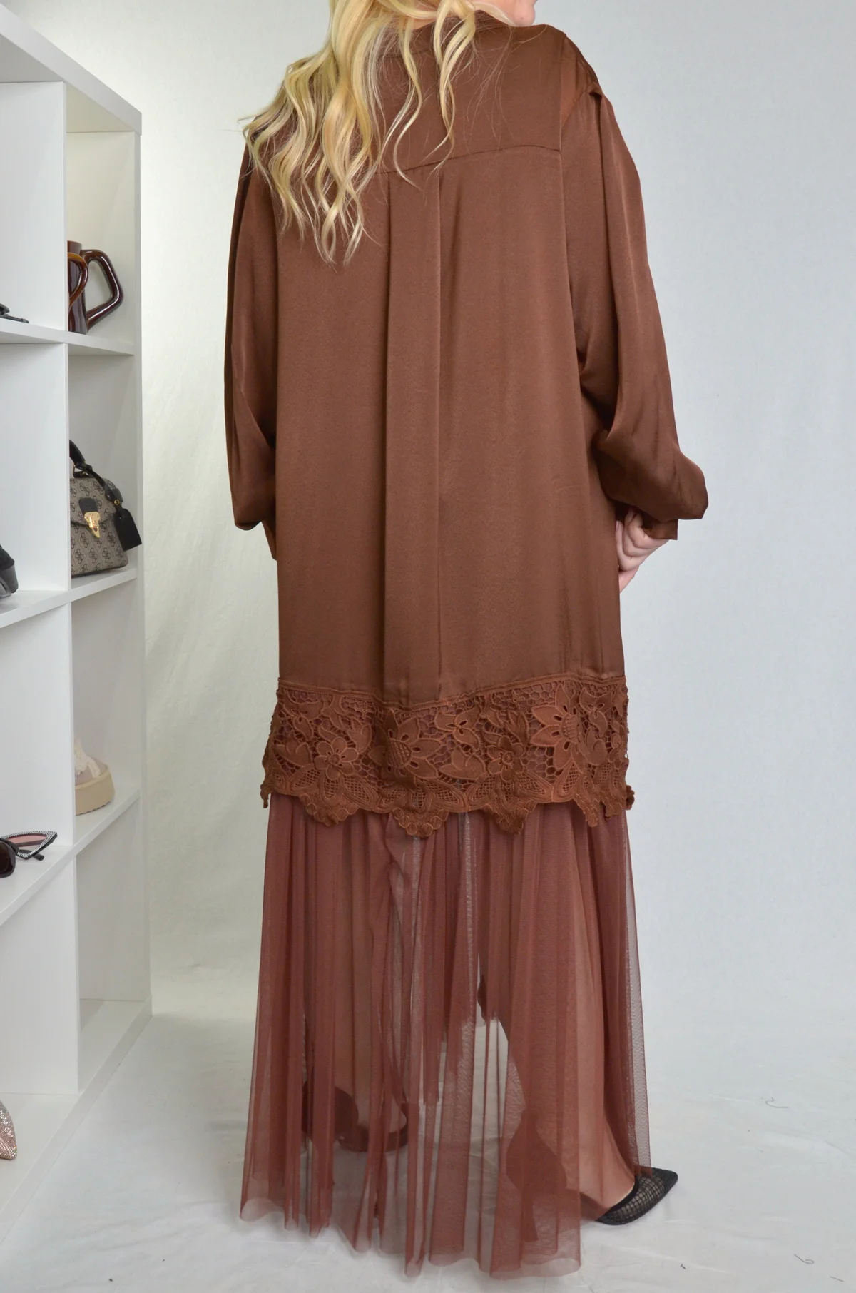 Elegantna plus-size haljina koju obučeš kad hoćeš da izgledaš top bez puno razmišljanja. Gore je lagani, satenski materijal koji lepo pada, a dole ide čipka pa til koji daje onaj wow efekat dok hodaš. Kroј je oversize, pa ništa ne steže – samo klizi preko tela i prijatna je za nošenje. Haljina je elegantna, idealna za neke lepše prilike kad želiš da izgledaš doterano, ali da ti je i dalje udobno.